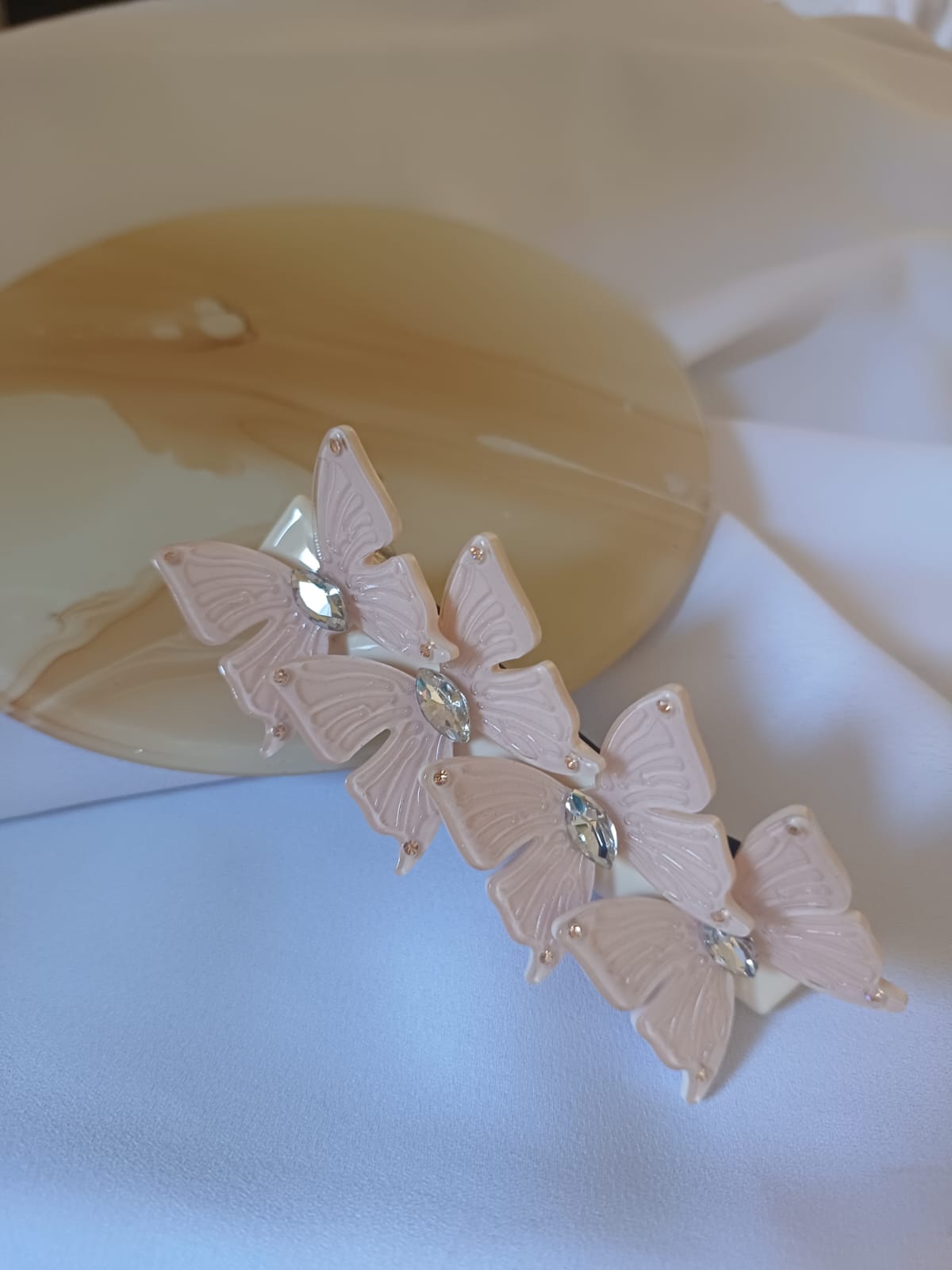 Prendedor de acetato com 4 borboletas. 9x4cm. Cor: rosa bebê